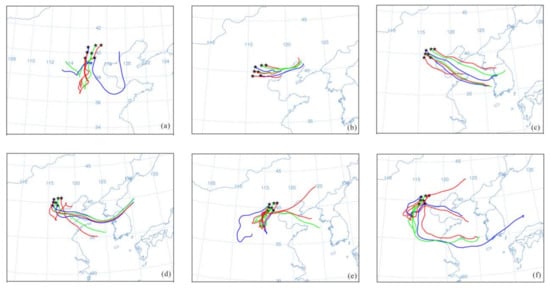 Moisture trajectories obtained using the HYSPLIT model through the layer from the surface to 1500 m for 48 h at 08:00 Beijing Time on (a) 15 July, (b) 16 July, (c) 17 July, (d) 18 July, (e) 19 July, and (f) 20 July.
