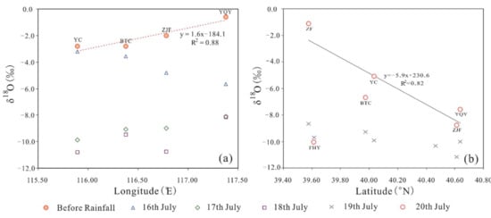 where is 9.3‰ assuming that the temperature is ~25 °C. Using P and δ18O values for the first two days, the initial isotopic values were calculated, as shown in Figure 9a. Increasingly negative values at higher (more westward) longitudes were obtained with a good correlation coefficient of 0.88 to which is in good agreement with the meteorological results from the HYSPLIT models. The initial δ18O value for the YQY station was about −0.6‰, similar to that of seawater [] which provided further evidence for an eastern moisture source from offshore. There was no remarkable difference in isotopes on 19 July, and the decreasing isotopic trend (Figure 9b) from south to north for the rainfall on 20 July was primarily caused by the southern moisture sources, with a negligible P effect. New southern air masses, mainly derived from terrestrial evaporation, were more enriched compared to isotopes of residual moisture. Therefore, precipitation δ18O was mainly controlled by the initial isotopic values, residual vapor fraction, and input of new air masses. The initial isotopic values were again dominated by moisture source and rainout process before arriving at the rainfall location, and the input of new air masses should be seen as a moisture source factor. Therefore, moisture sources and residual vapor fraction during the rainout process dominated the rhythm of δ18O in the monsoon-affected region of Beijing.