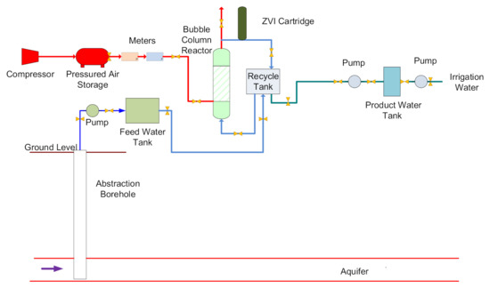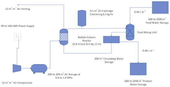 The reactor type is a batch flow, bubble column, static bed, recirculating diffusion reactor [10]. The reactor train has three active components: (a) a bubble column reactor; (b) a ZVI cartridge; and (c) a recycle water tank.