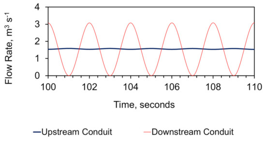 Example wave structuring created by an EPB, where the USA receives a constant gas flow rate through the upstream conduit and the gas is discharged in pulses from the USA to the DSA via the EPB. This results in a pulsed gas outflow through the downstream conduit from the DSA.