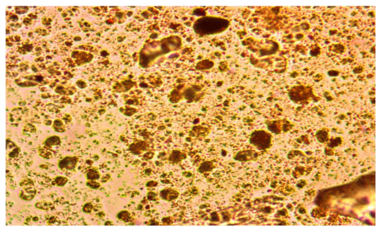 Catalyst, transmitted light, field of view = 0.5 mm. Particles are quartz grains coated in n−FeOxHy polymers.