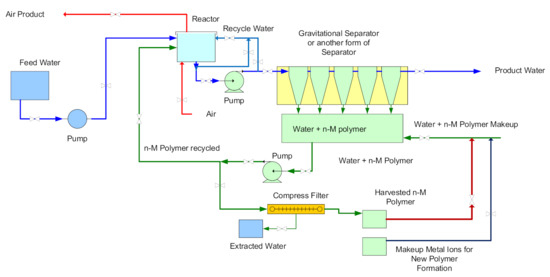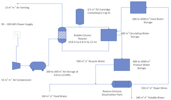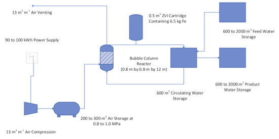 The reactor train process flow used in this study is summarized in Figure 1. It comprises a feed water tank, a product water tank, a bubble column reactor, a recycle water tank, an air compressor, and an air storage tank. These units are connected by conduits.