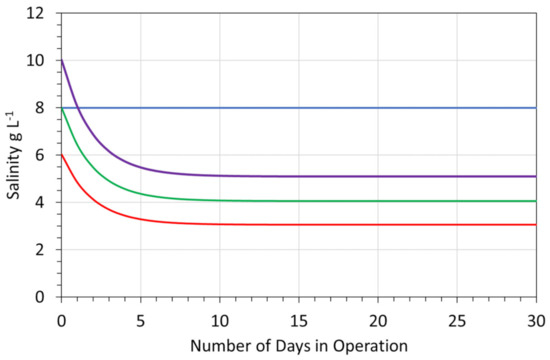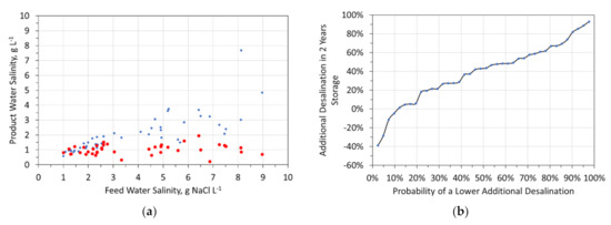 The product water salinity, measured as EC or g NaCl L−1, is lower than the feed water salinity (Appendix A, Figure A1).