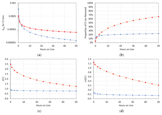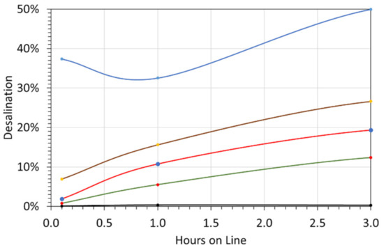 Probability distribution for ion removal versus hours on line. (a), Desalinations vs. hours on line; (b), Sodium removal versus hours on line; (c), Chloride removal versus hours on line. Black line = minimum ion removal; green line is 25% probability of a lower removal; red line is 50% probability of a lower ion removal; brown line is a 75% probability of a lower ion removal; blue line is a 98% probability of a lower ion removal. Vertical orange line is this study. Vertical purple line is a separate reactor type [10], which terminated operation after 3 h.