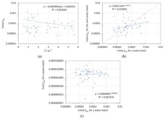 The following parameters were measured for each feed water and product water sample: pH, Eh, EC, Cl− ion concentration, Na+ ion concentration, and temperature. These measurements are placed in Appendix A, Table A1, Table A2 and Table A3, and Figure A1, Figure A2, Figure A3, Figure A4, Figure A5 and Figure A6.