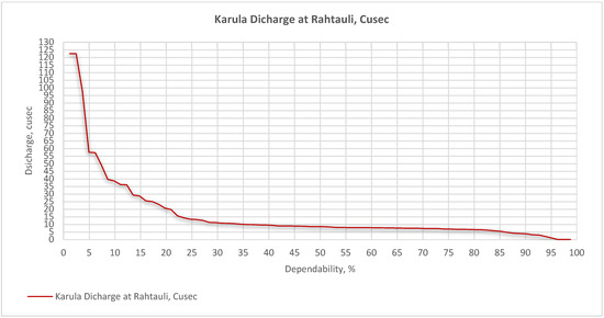 The Karula River is not gauged, therefore the team started taking hydrological and hydraulic observations on fortnightly basis since mid of 2017 (with an objective to develop some understanding of flows in the river). The information on flows and hydraulic parameters were generated through these on-site observations (2017–2021). This led to the understanding of the general flow’s patterns and variations in water levels in the river across various seasons. Based on four years of data, the dependability curve was developed and the same is presented in Figure 1.