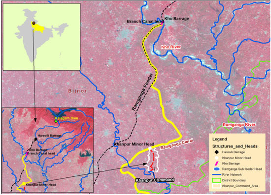 Ramganga water resources are stored in a reservoir called Kalagarh Dam, which is the second biggest dam-based reservoir (after Tehri dam) in the state of Uttarakhand, storing over 2448 million cubic meters of water, as per the National Register of Large Dams 2019, Central Water Commission [13]. The Kalagarh Multi-purpose Project was designed for irrigation, flood protection and production of electricity with an installed capacity of 198 MW (Uttarakhand Irrigation Department). The major proportion of water in Kalagarh dam is allocated to augment the lower Ganga Canal System (85%) while the rest is allocated to small independent canal systems known as the Ramganga sub feeder (10%) and Pheeka canal system (5%)—as per the information from authorities.