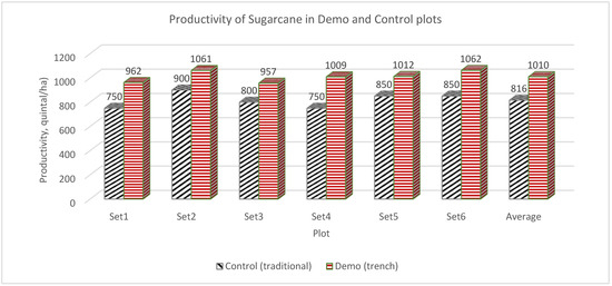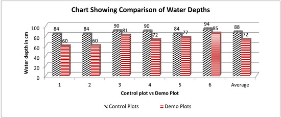 The water used for sugarcane irrigation, both in demo and control fields, was compared with its ideal (theoretical) requirement. The actual discharge from tube wells with a 4-inch delivery pipe to the irrigation channel was measured at the site, using area velocity method and volumetric measurement. On this basis, an average discharge of 0.014 cubic meter/second (40 litres per second) was adopted. A primary survey was conducted to gather information regarding the actual running time of tube-wells in demo and control plots for each irrigation/season. The volume of water applied in a field was calculated by multiplying the discharge with water application time. The irrigation water depth applied to a plot was calculated by dividing the total volume of water applied by the area of the plot. The ideal (theoretical) crop water requirement is as per FAO (Food and Agriculture Organization) norms using CROPWAT—a tool for calculating crop water requirements. The meteorological data of the nearest climatological station (Bareilly) was used. The rainfall data of the district Bijnor was taken, and the value of crop coefficient “Kc” was taken from guidelines issued by CWC (Central Water Commission, Government of India) in 1984 (Technical Series 2: A Guide for Estimating Irrigation Water Requirement, Ministry of Irrigation, Water Management Division, New Delhi, May 1984 [19]. The theoretical irrigation water depth for sugarcane crop computed using FAO’s CROPWAT Program is calculated as 67.6 cm, including the 25% leaching requirement. Against this norm, the current irrigation water depth in control plots (without trench method) was calculated as 87.6 cm. The irrigation water depth in demo plots (with trench method) was calculated as 72.3 cm.