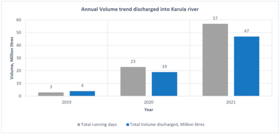 Now, after the rehabilitation, the irrigation system is fully functional whenever the Khanpur Minor Canal gets water as per the roster (which is the mechanism of irrigation scheduling, that defines the date and time of water distribution for various canals within a system, in a turn-by-turn fashion) issued by the UPI & WRD. The canal system is run as per the roster. The saved water from the canal is now released into the Karula river through the passage. The Khanpur Minor Canal generally runs for 6–8 months in a year (depending upon water availability in the reservoir and irrigation water demand by the command farmers). From May 2019 until June 2021, the Khanpur Minor canal, through the passage, discharged a total of 62.55 million litres of water saved from irrigation to the Karula river across 67 days from May 2019 to June 2021. The discharge from the tail end of the Khanpur canal into the Karula river within this period ranged from 0.0033–0.022 cumec (3.4–22.6 litres per second), with an average flow rate of 0.011 cumec (11.9 litres per second), which is 11% of the ‘designed discharge’ of Khanpur Minor canal. Figure 5 shows the temporal variation in saved water discharged into the Karula river since May 2019.