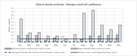 Figure 6 gives an idea of minimum flows in Karula River and average discharge in Khanpur Minor vis-à-vis number of days in respective months, the saved water flown into the river.