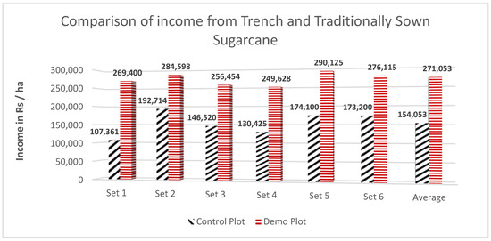 Besides changes in sugarcane productivity and saving in irrigation water, the trench method offers opportunities to the farmers to grow a second crop in the sugarcane fields, simultaneously, between the ridges. Most of the farmers grow mustard or black-gram (urad) as an additional crop. These crops are not provided additional irrigation as their less water requirement is easily met with the soil moisture regime of the sugarcane crop. Farmers can use the additional crop for their consumption as well as to gain extra income from it. It has been calculated from demo farm data that the average income of multi-cropped sugarcane fields is around 20% higher (with the range between 15% and about 26%) than the single sugarcane crop sown with Better Management Practices, including the trench method, as shown in Figure 10.