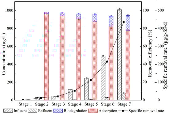 It can be seen that over 90% of the ENO was removed in the SRUSB bioreactor during the long-term operation at different ENO concentrations (Figure 1). According to our batch test results (control test, as shown in Figure 2), ENO removal occurred via hydrolysis and photodegradation could be ignored. Therefore, the removal of ENO in the SRUSB bioreactor was mainly attributed to adsorption and biodegradation. Moreover, the specific removal rate of ENO in the SRUSB bioreactor increased from 13.1 ± 0.3 μg/g-SS/d in Stage 2 to 434.7 ± 4.6 μg/g-SS/d in Stage 7. Interestingly, the biodegradation efficiency of ENO increased from 1.9 ± 0.9% in Stage 2 to 16.9 ± 0.7% in Stage 7, with increasing influent ENO concentrations.