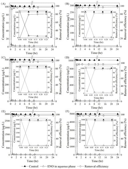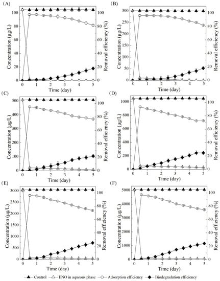 ENO biodegradation in the sulfate-reducing sludge system at different initial concentrations: 100 (A); 300 (B); 500 (C); 1000 (D); 3000 (E); 5000 μg/L (F).