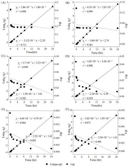 Pseudo-first-order and pseudo-second-order kinetic model fitting of ENO adsorption by the sulfate-reducing sludge (pseudo-first-order model, y1; pseudo-second-order model, y2): 100 (A); 300 (B); 500 (C); 1000 (D); 3000 (E); 5000 μg/L (F).