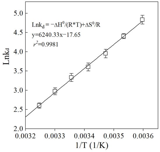 The ENO adsorption isotherms by the sulfate-reducing sludge were evaluated using the Henry, Freundlich and Langmuir adsorption isotherms via batch experiments at different reaction temperatures (i.e., 5–35 °C). The Henry and Freundlich isotherms were well correlated with the adsorption of ENO by the sulfate-reducing sludge based on the correlation coefficient r2 (Table S6 in the Supplementary Materials), suggesting that the adsorption process between ENO and the sulfate-reducing sludge was dominated by multilayer adsorption rather than monolayer adsorption [,]. Additionally, the adsorption thermodynamics of ENO were also analyzed to gain insight into the adsorption process as shown in Figure 4 and Table S7 in the Supplementary Materials. The adsorption of ENO by the sulfate-reducing sludge was a spontaneous and exothermic process according to the obtained negative values of Gibbs free energy (ΔG°) and enthalpy change (ΔH°) [,,]. The absolute value of ΔH° is commonly used to distinguish physisorption (adsorption heat within a 0–20 KJ/mol range) and chemisorption (adsorption heat within an 80–400 KJ/mol range) [,,]. The absolute value of the enthalpy change (i.e., ΔH° = 51.882 KJ/mol) of the ENO adsorption by the sulfate-reducing sludge was in the range of 20–80 KJ/mol, suggesting that the adsorption process of ENO by the sulfate-reducing sludge involved both physisorption and chemisorption [].