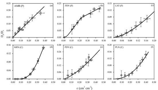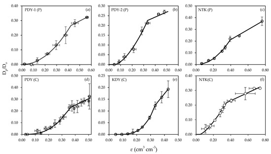 Measured soil-gas diffusivity against air-filled porosity for six repacked soils ((a–f), together with proposed descriptive two-region model (Equations (6) and (7)). PDY; Peradeniya (Sri Lanka), NTK; Nishi-Tokyo (Japan), KDY; Kandy (Sri Lanka). P and C in parentheses denote Pasture and Cultivated, respectively.