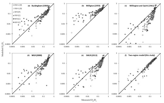 To examine the performance of existing widely used predictive models on agricultural topsoils, we tested five selected predictive models, which comprise both classical and recent models, against the measured Dp/Do for undisturbed topsoils (Figure 3). Evidently, excluding the Millington (1959) model [25], all other models tended to markedly underpredict diffusivity in undisturbed soils. In fact, predictions were better for cultivated soils than for pasture soils due to the altered structural properties in pasture soils, as discussed above. The Millington and Quirk (1961) model [26], the widely accepted model for predicting soil-gas diffusivity in gas transport models, tended to overpredict the Dp/Do in dry soils and markedly underpredict the Dp/Do in wet soils, as reported in many previous works in the literature [17,27,28].