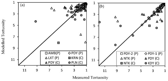 Pore tortuosity analysis using the two-region descriptive model (Equations (6) and (7)) for (a) intact and (b) repacked soils. AMB; Ambewela (Sri Lanka), PDY; Peradeniya (Sri Lanka), LXT; Lexington (United Kingdom), KRN; Kurunegala (Sri Lanka); PLN; Polonnaruwa (Sri Lanka), NTK; Nishi-Tokyo (Japan), KDY; Kandy (Sri Lanka). P and C in parentheses denote Pasture and Cultivated, respectively.