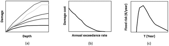 Damage–Depth curve (a), Damage—annual exceedance rate curve (b) and Flood risk density curve (c).
