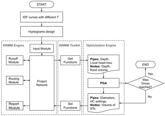 The optimization model used a PGA as a search engine; this type of algorithm, unlike traditional genetic algorithms, uses an integer encoding. The PGA was connected to the SWMM model through a toolkit to perform a series of simulations to find an optimal solution to the problem. To achieve this, the PGA evaluated an objective function composed of two types of cost functions: the annualized costs of infrastructure investment and the costs of the annual cost of flood risk. This implied that design rainfalls must be defined in advance for different return periods. The rainfall was constructed by means of a design hyetograph obtained through the analysis of intensity–duration–frequency (IDF) curves. These rainfalls were introduced into the network to be analyzed by the model. Figure 2 summarizes the operation of the optimization model. The optimization process was iterative and required establishing an end point for a process called the convergence criterion (Gmax). This criterion considers that when the value of the objective function does not change during a certain number of generations, the objective function has reached its minimum and the process ends. Gmax is explained in depth in the work presented by Bayas-Jiménez et al. [14].