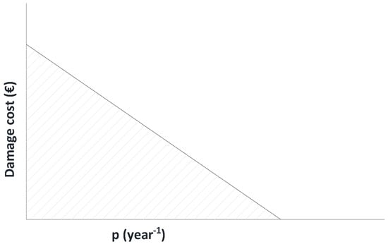 Once the cost of flooding had been defined, to proceed in analyzing the flood risk, we started from the work presented by Arnbjerg-Nielsen and Fleischer [28], who proposed a way of estimating the annual damage by relating the cost of flood damage from rainfall of various return periods. The authors conclude that the annual damage can be obtained by integrating the area under the curve obtained from plotting the flood cost (Cy(Di)) as a function of its annual exceedance rate (p). In a more recent work, Olsen et al. [21] mention that a good approximation of the curve can be obtained with a log-linear relationship and that, when integrated, it can show the average annual cost of flood risk; Figure 3 shows this relationship.