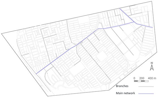 Drainage networks are generally made up of branches that collect rainwater from specific areas previously defined in the design stage of the drainage network. The water carried by these branches is discharged into a main network that collects the water from all the branches and transports it to treatment plants. Figure 4 shows an example of this network configuration.