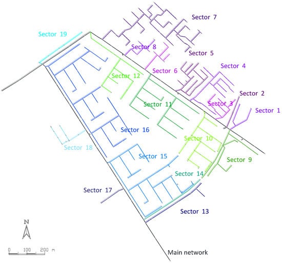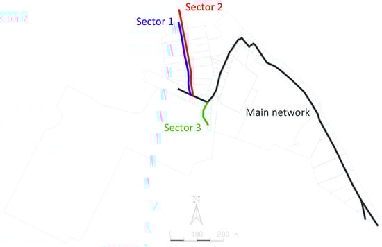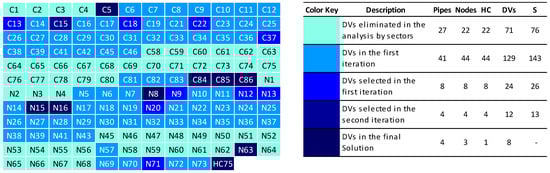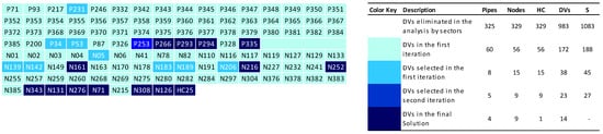 For better visualization, the sectors of the drainage network and the main network are differentiated in Figure 7. Applying the SSR method to each sector reduces the number of DVs considerably. The method is applied iteratively until SS cannot be reduced. Table 3 shows the percentage reduction in SS magnitude.