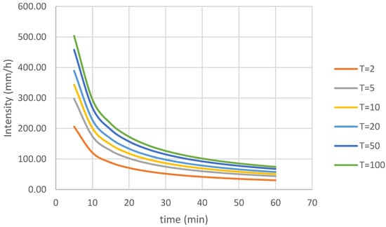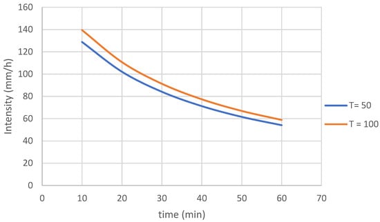 For the case study, two rainfalls were defined, designed with two return periods of 50 and 100 years and calculated by the method of alternating blocks with 10-min intervals. Rainfall was calculated from previously defined IDF curves. The curves obtained are shown in Figure 8. On the other hand, for the network study, the percentage of different land uses in the study area were established. Table S6 of the supplementary material shows these land uses.