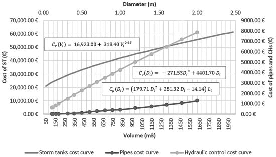 where CT(Vi) represents the cost in euros of the construction of a storm tank. Cmin represents the minimum cost of building a storm tank. Vi is the flood volume that the tank must store in cubic meters. Cvar and ω are coefficients corresponding to the analyzed project. The third structural investment cost function determined for this work was the cost of hydraulic control. To define this function, the cost of purchasing and installing valves of different diameters was analyzed. This analysis determined a second-degree polynomial function, shown in Equation (3).