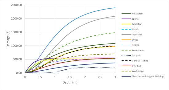 For the study of flood costs, the damage–depth curves presented by Martínez-Gomariz et al. [32] were analyzed. The authors present a series of curves for different types of buildings. Taking these curves as a reference, Equation (7) was used to determine the flood damage cost for different land uses. The expression adjusted quite well to the values that the authors present. Table S7 of the Supplementary Material shows the goodness of fit. Figure 10 shows the damage–depth curves obtained. Thus, all the cost functions required for the study of risk in economic terms for the developed model were defined. The coefficients used to define the curves for the different land uses analyzed are shown in Table S8 of the Supplementary Material.