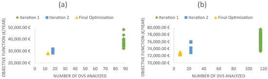 After the application of the SSR in each sector, a new scenario is configured for the optimization of the network that includes the selected DVs in each sector and in the main network. Applying the method in this scenario iteratively defines the final search region. Later, for the final optimization, a refined list of options for the STs is used and the hydraulic control elements are included in the search. At this stage, a much more demanding stopping criterion for the algorithm is also used to find the solution close to the optimal value. After performing a series of simulations, the best possible solution is obtained. Figure 13 shows the SSR until the final solution is found. Table 4 shows the terms that compose the objective function of the solution found and the characteristics of the elements to be implemented. Figure 14 illustrates the elements to be installed in the network. Finally, the dispersion of the different results obtained from the objective function in each iteration and the number of DVs in the case study networks are shown in Figure 15.