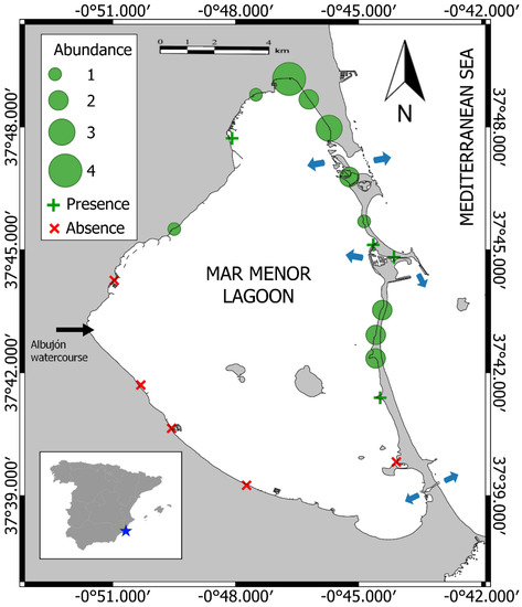 Location of the Mar Menor lagoon and sites where Batophora has been observed. Green circles mark sites where Batophora was detected in the present study (size indicates abundance of this species, see Material and Methods); green crosses indicate presence, while red crosses mark studied sites where this species was not found. The black arrow marks the Rambla del Albujón watercourse outlet, whereas blue arrows show the three inlets connecting the lagoon and the Mediterranean Sea.