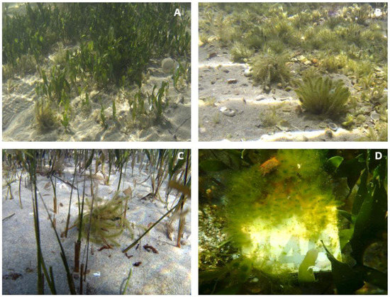 Specimens of Batophora in different habitats. Shallow Caulerpa prolifera meadow (0.5 m depth) (A), sandy bottom (B), shallow Cymodocea nodosa meadow (0.5 m depth) (C), and PVC plates on experimental plots settled on Caulerpa prolifera bottoms (D).
