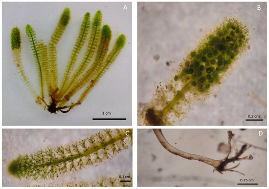 A population of this genus has recently been discovered in a coastal lagoon connected to the sea in the island of Formentera (Balearic Islands), where it experienced a rapid bloom [39]. The characters analyzed in our work (habit, gametophore size, gametophore distribution, gametangia size) largely overlap with those reported in the population of Formentera except for the presence, in our case, of some fertile axes with distinctly oval mature gametophores and nondetection of gametophores in the second whorl branchlet internode (Figure 5, Table 1).