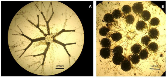 Cross-section of a vegetative axis (A) and a fertile axis (B). Six ditrichotomous branchlets shaping a whorl can be noted (A). Fertile axes with spherical gametophores inserted in the distal part of the basal internode of the whorl branchlets (B).
