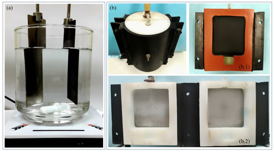 Electrochemical reactors: batch mode (a) and the flow cell (b) with the Ti/RuO2 anode placed in the middle of the reactor (b.1), and the opened reactor detailing the two stainless steel plates as cathodes.