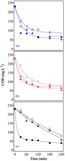 This mix of oxidants remains at the reaction cage (BDD-•OH/SO4•−/S2O82−), oxidizing several organic pollutants in different water matrices [44,48], deactivating microorganisms [47,49], and depolluting soil matrices (by using soil washing, electrokinetic soil remediation, or soil flushing) [50,51]. However, ionic species in the water matrices could act as scavengers, trapping the oxidants and, consequently, reducing their oxidative action [24,52], like Cl−, HCO32−, and others. Therefore, the effectiveness of the process was also evaluated by the organic matter degradation (COD) and mineralization (TOC).