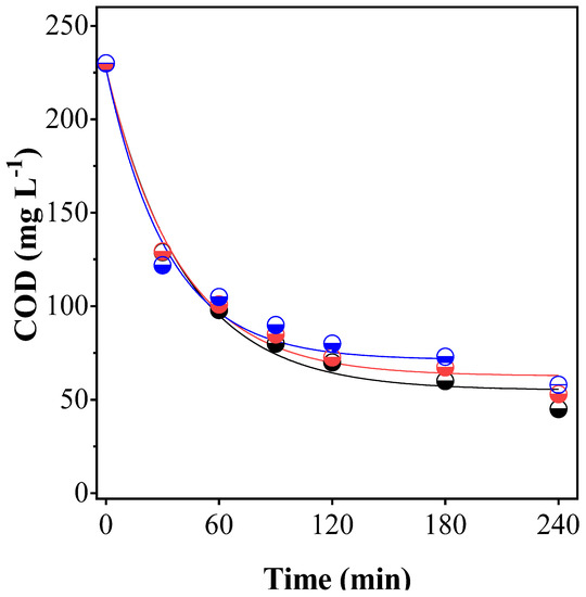 An Ilim of 0.11 A was estimated, considering a km of 1.9 × 10−5 m s−1. This current value is lower than all the currents applied in this work (0.14, 0.41, and 0.82 A for 10, 30, and 60 mA cm−2, respectively), confirming that the AO technology, under these conditions, is taking place under mass transport control. On the other hand, Ilim of 0.11 A is significantly lower than 0.81 (value estimated for the j of 60 mA cm−2), which explains the fact that there was not a significant enhancement at higher j, as a consequence of a higher charge which was consumed in parasite non-oxidizing reactions such as oxygen evolution. These assumptions, treating a real water matrix, are in agreement with various studies [37,38,39] about the EO of real wastewater. Based on the results obtained, a j of 30 mA cm−2 was selected as the optimum value to be applied in a new set of experiments by adding Na2SO4 as a supporting electrolyte where the effects of the reduction of COD were studied with Ti/RuO2, Ti/Pt, and Nb/BDD anodes.