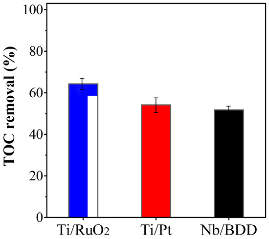 In terms of COD removal, as can be observed in Figure 3, no significant removals were achieved (ranging from 75–80%) by applying 30 mA cm−2 when sulfate was added in the effluent. Comparable efficiencies were achieved without the addition of sulfate in the effluent (78.26%, 81%, and 78.2% of COD removals were achieved at Ti/RuO2, Ti/Pt, and Nb/BDD anodes, respectively), under similar experimental conditions. Nevertheless, some differences were observed when the mineralization removal was determined by TOC measurements (Figure 4). As can be observed, Ti/RuO2 anode efficiently mineralized the organic matter, reaching approximately 64.61%. Meanwhile, Ti/Pt and Nb/BDD anodes achieved about 54.20 and 51.74% of TOC removals, respectively. This behavior can be associated with the electrode deactivation of surface and oxidants scavengers. In the former, Pt surface can be deactivated due to the adsorption of BTEX compounds or their oxidation byproducts [42]; while the oxidants electrogenerated at BDD could be trapped by the scavenger species in the water matrix, in the latter. Conversely, the enhancement on the mineralization at Ti/RuO2 can be related to the occurrence of direct electrochemical oxidation of organics and byproducts at its surface (without surface deactivation), in concomitance with the oxygen evolution reaction.