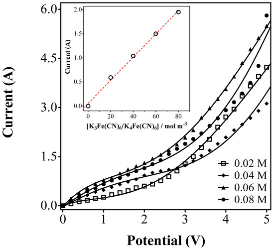 The mass transfer characterization of the pre-pilot plant was firstly performed (Figure 1). Then, the polarization curves (current response vs. voltage) were registered during electrolysis, in the electrochemical flow reactor, of different solutions of ferricyanide (i.e., 20–80 mol m−3) in 0.5 mol L−1 NaOH at a constant flow rate of 4.25 × 10−5 m3 s−1. As can be observed from Figure 5, well-defined limiting current-profiles were achieved at all polarization curves. It is clear that the limiting current increased when an increase in the concentration of ferricyanide solution was attained. This behavior indicated that the mass transfer rate at the electrode surface depends on the concentration of ions in the electrolyte. By plotting the limiting current profiles, as a function of the ferricyanide concentration, a linear relationship was reached (inset in Figure 5) and, consequently, the experimental km was estimated by Equation (5).