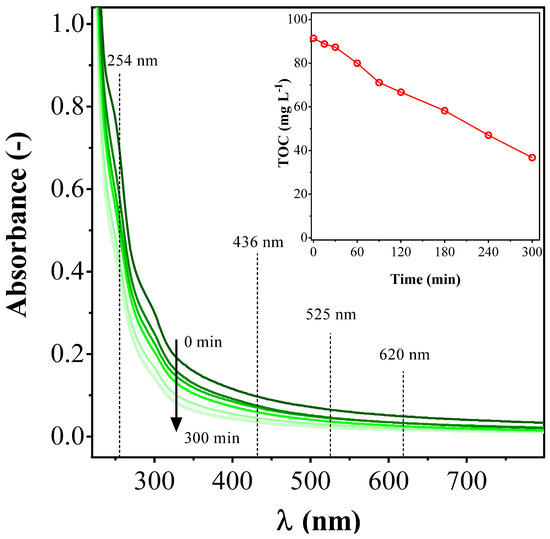 Wavelength spectrum and TOC decay (inset), as a function of time, of 5 L of polluted groundwater effluent by applying 30 mA cm−2 at 25 °C in presence of Na2SO4 (≈0.5 M), with the pilot plant with Ti/RuO2 double-side anode.