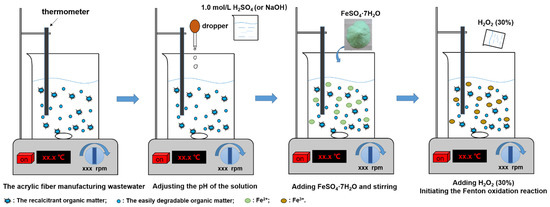 The experimental setup and procedure are shown in Figure 1. Firstly, 300.0 mL of acrylic fiber wastewater was added to the 500.0 mL beaker. The pH adjustment was achieved by titrating 0.1 or 1 mol/L of H2SO4 (or NaOH) solution under the condition of stirring intensity around 140 rpm. In which the pH of the solution was monitored by (LEICI PHB-4) portable pH meter to achieve precise regulation of the solution pH. Secondly, FeSO4·7H2O was added to the solution and stirred at 140.0 rpm. In addition, H2O2 (30% in mass fraction) was added to the solution to initiate the Fenton oxidation reaction. Finally, samples were taken at intervals to test the concentrations of Fe2+, COD, and H2O2.