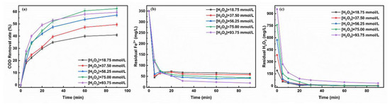 Influence of initial concentration of H2O2 on COD removal rate (a), the residual concentration of Fe2+ (b), and the residual concentration of H2O2 (c).