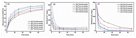Influence of initial concentration of Fe2+ on COD removal rate (a), the residual concentration of Fe2+ (b), and the residual concentration of H2O2 (c).