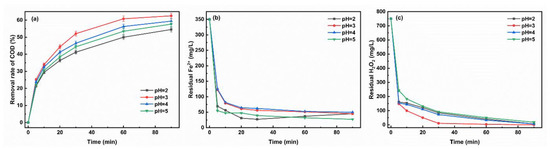 The results presented in Figure 4a showed that it can be obtained the highest COD removal rate of 65.79% at a pH of 3.0, then the removal rate decreased slightly as the pH increased. According to the reaction mechanism of the Fenton reagent, the initial pH could directly interfere the complex equilibrium system of Fe2+ and Fe3+ in the solution, thereby affecting the oxidation ability of the Fenton reagent. As exhibited in Figure 4b,c, when the pH value was 2, the concentration of Fe2+ in the solution was relatively low while the concentration of H2O2 was relatively high within 30 min before the reaction. Due to the higher concentration of [H+], the reaction Equation (5) was in a reverse reaction state. Fe3+ reduction to Fe2+ was inhibited in this state, and the catalytic reaction could not proceed smoothly [36]. As a result, the generation rate of HO• was slowed down, and the oxidation capacity was reduced. When the pH value was > 3, it was obvious that the removal rate of COD gradually decreased, mainly due to the increase of OH- concentration, which leads to the decrease of reaction rate Equation (1), and thus the amount of HO• decreases. As shown in Figure 4b,c, most of the Fe2+ and H2O2 in the system reacted quickly and were consumed during the first 10 min. When the reaction time was between 10 and 30 min, the Fe2+ concentration gradually decreased and tended to be stable. When the pH was 2, 4, and 5, the concentration of H2O2 did not stabilize until 90 min. Notably, the highest utilization and reaction rate of H2O2 was achieved at pH 3, and the reaction equilibrium could be reached within 30 min. Therefore, the optimal pH value of this study was 3.0, which was consistent with the results of other research.
