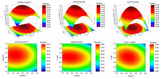 According to Table 2, the p value of A × B, A × C, and B × C were 0.831, 0.533, and 0.0623, respectively. To further determine the interaction between variables, the model Equation (1) was used for fitting, and the result was shown in Figure 5. It was clear that the removal rate of COD increased from 29.20% to 59.30% with the changes of A and B, when the pH was 3 (code value was 0). A view of Figure 5a,d, at the position of the center point, the range of A was near the −0.61 level and the range of B was near the 0.25 level. From Figure 5b,e, at the position of the center point, the range of A was near the −0.65 level and the range of pH was near the 0.10 level. As described in Figure 5c,f, at the position of the center point, the range of B was near the 0.25 level and the range of C was near the 0.1 level. The larger the difference between the coded value of the Center Point and the 0.00 level, the greater the interaction between the two factors [38]. As explained previously, the order of the influence of each variable on COD degradation was: A-[H2O2] > B-[Fe2+] > C-pH. In addition, it was apparent that the interaction between B-[Fe2+] and C-pH had a more substantial impact.