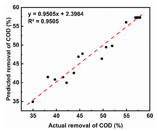 As shown in Figure 6, after linear fitting between the predicted and actual values, the R2 was 0.95, which showed that the predicted result had a high degree of credibility [39]. With the use of the Fenton process to degrade COD in acrylic fiber wastewater, and through response surface optimization analysis, the optimal degradation conditions were: (i)the initial concentration of H2O2 was 60.30 mmol/L; (ii) the initial concentration of Fe2+ was 7.46 mmol/L; (iii) the pH was 3; (iv) COD removal rate was 59.22%. The experiment was repeated three times under the above-optimized conditions, and the results were presented in Table 4. Obviously, it can be observed that after treatment, the acrylic fiber wastewater effluent can meet the secondary discharge requirements of the “Integrated Wastewater Discharge Standard” (GB4287-2012) [40].). The COD removal rate’s actual and predicted values were 63.2% and 59.8%, and the error was less than 5%. Therefore, the confidence of the obtained model was strong.