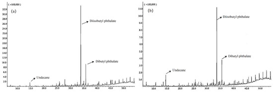 GC-MS patterns: (a) raw water, (b) water samples treated by Fenton process.
