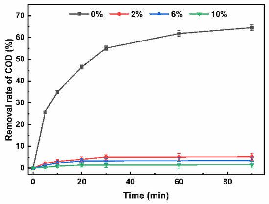In addition, a great deal of HO•, which had high oxidation, was produced through the above reaction. In order to demonstrate that the degradation of acrylic acid wastewater is based on the oxidation of HO•, HO• scavenging experiments based on the degradation of acrylic acid wastewater by Fenton system were carried out. It has been shown that isopropyl alcohol reacts rapidly with HO- and competes with the target substrate, thus effectively inhibiting the reaction of the target substrate with HO• [48]. Therefore, in this experiment isopropyl alcohol (IPA) was used to remove the active species associated with the degradation of organic matter. Figure 8 shows the effect of using different concentrations (0%, 2%, 6%, 10%) of isopropanol on the degradation of organic matter in acrylic acid wastewater based on the optimal fenton process conditions (mentioned in Section 3.2.3). As can be seen from Figure 8, the inhibition effect of isopropanol is obvious, with 2%, 6%, and 10% isopropanol almost completely inhibiting the degradation of organics. It indicates that HO• is the main active species in this Fenton system for the degradation of organic matter. Therefore, the mechanism in the degradation process of organic matter in acrylic wastewater was speculated as follows. In the presence of organic molecules (RH) from acrylic manufacturing wastewater, the generated HO• attacked the organic molecules by absorbing protons, producing highly reactive organic radicals (R•), which could be further oxidized to generate ROH Equations (10) and (11) [20,43,49]. Further, ROH was oxidized by HO• to form R1OOH and R2H to achieve the conversion of organic macromolecules to organic small molecules Equations (10) and (11). In addition, R1OOH was easily oxidized by HO• to form smaller molecular weight organic matter (R3H), H2O and CO2 Equation (12). The efficient degradation of organic matter in acrylic wastewater was achieved through the oxidation reactions of Equations (10)–(13) (where R, R1, R2, and R3 represent one or more products in the degradation stage). Furthermore, H2O2 was generated via a reaction among HO• Equation (14).