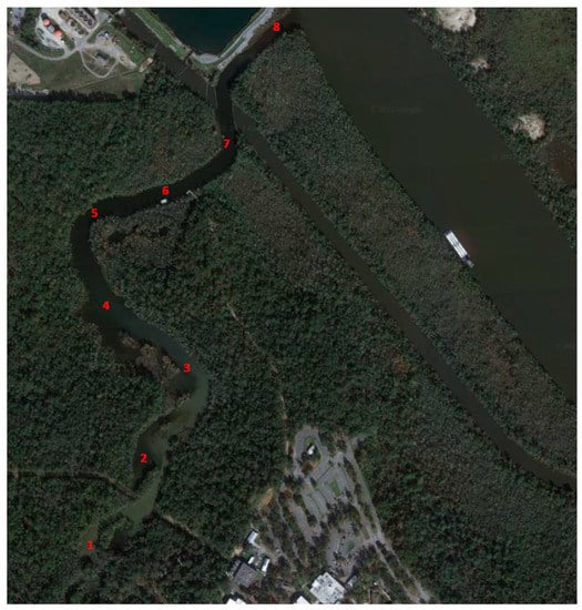 Beyond this, the significant increase in pH from Sites 7 to 8 suggests the final influence on the general water quality of Thompson Bayou—the hydrology of the Escambia River (Figure 6). Escambia River-mediated effects on Thompson Bayou are even more pronounced for DO and, especially, SC. Both variables increased significantly with distance, with a notable increase in DO at Site 4 likely caused by dense macrophytes at that location (Figure 4). On the other hand, SC displayed a nearly linear pattern of increase from Site 1 to Site 8 (Figure 5). The Escambia River empties into Escambia Bay ~4 km from where Thompson Bayou joins the river.